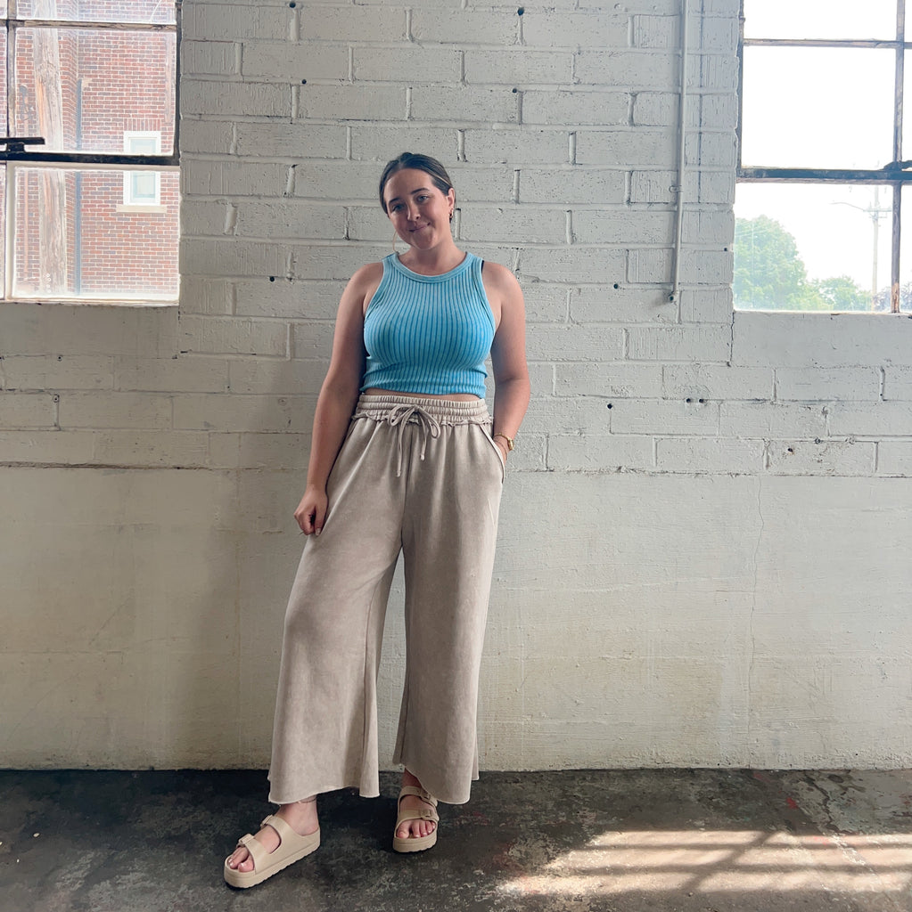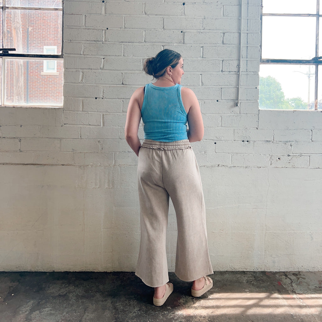 ACID WASH FLEECE PALAZZO SWEATPANTS WITH POCKETS - DRAWSTRING BAND WAIST - POCKETS - RAW HEM