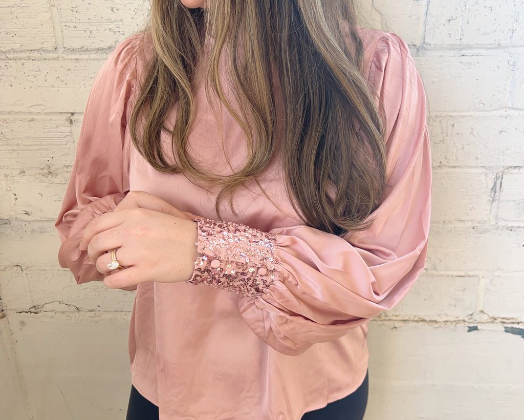 BOAT NECK LONG SLEEVE WITH SEQUIN CUFF DETAIL SATIN BLOUSE TOP.