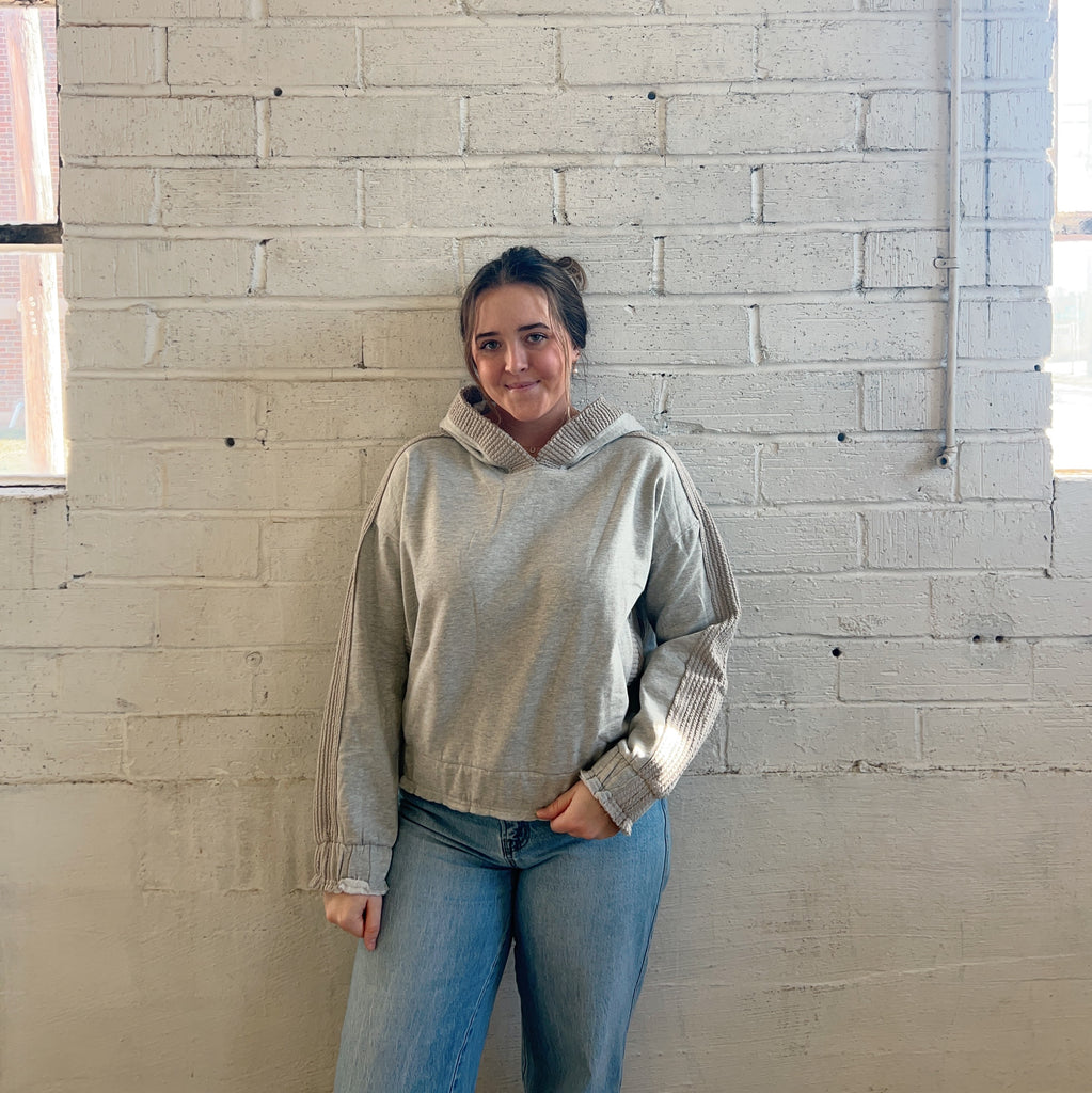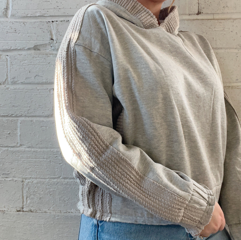 BRUSHED TERRY MIX MEDIA BLOCK SWEATSHIRT - Brushed terry mix media block design for a modern, textured look - Features contrast ribbed panels along sleeves, sides, cuffs, and hood - Relaxed fit with dropped shoulders for casual comfort - Elastic banded hem and cuffs create a flattering, easy silhouette - Hooded neckline for added versatility