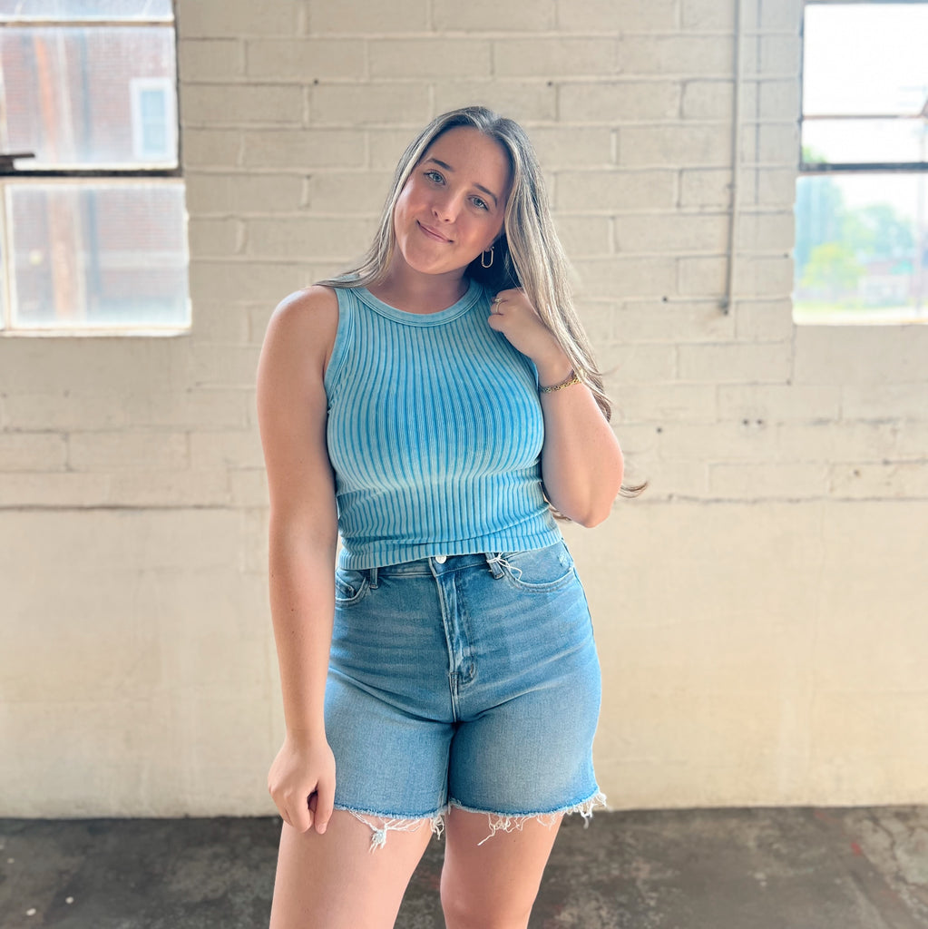 Seamless ribbed tank top, cropped with a high neckline.